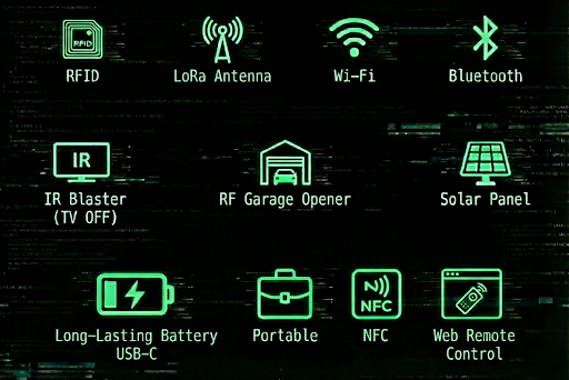 - Radio Frequency (Flipper Style): Clone garage remotes and open barriers.